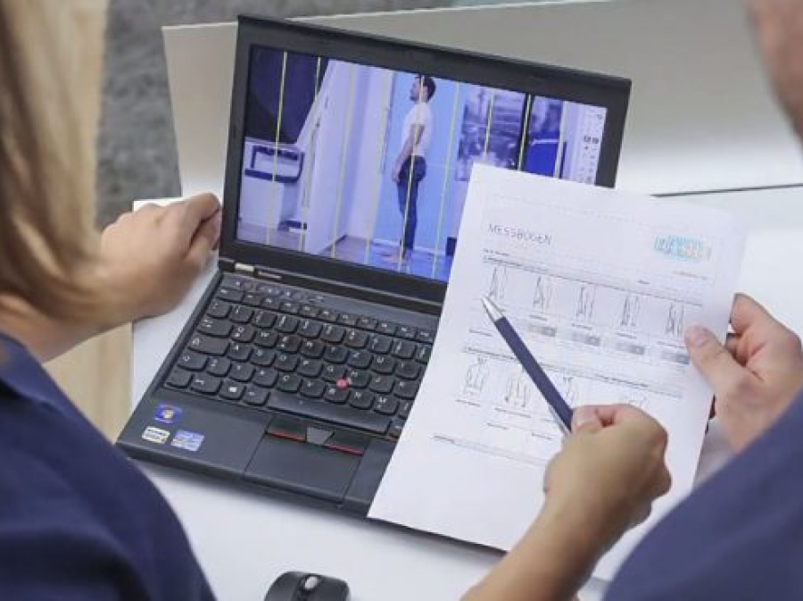 Mit 2 HD Kameras wird je ein Bild aus lateraler und dorsaler Perspektive aufgenommen. Graphische und tabellarische Auswertung.